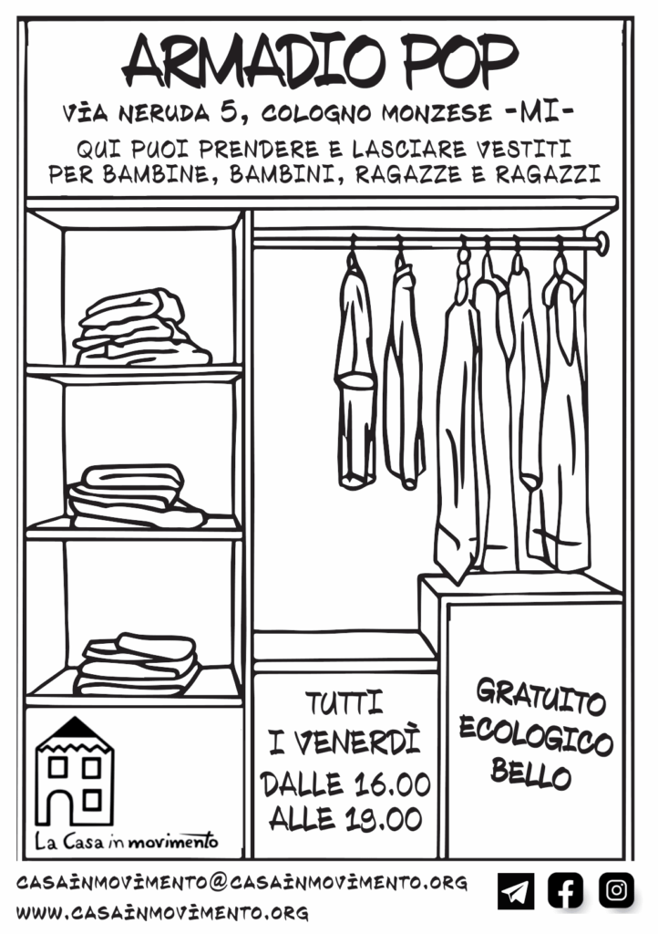 Vorremmo anche che Armadio pop sia uno spazio di incontro e socialità tra genitori e perché no, anche tra i loro figli! Sentiti quindi libero/a di invitare amici e amiche!