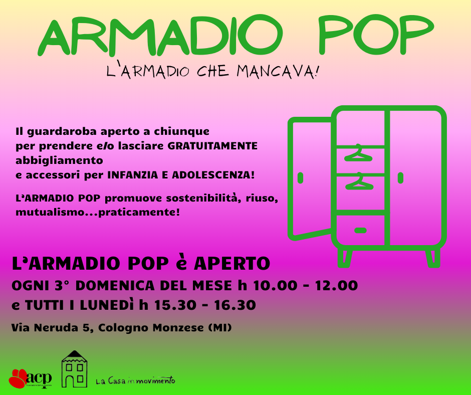 Dopo la pausa per le vacanze natalizie, Armadio Pop riapre e anticipa l’apertura! Tutti i venerdì, a partire dalle 16.00, lo spazio sarà aperto per donare, prendere e scambiare tra le persone presenti vestiti e accessori di abbigliamento (sciarpe, cappelli, scarpe, etc) per neonati e neonate, bambini e bambine, ragazzi e ragazze Chiediamo che i