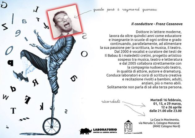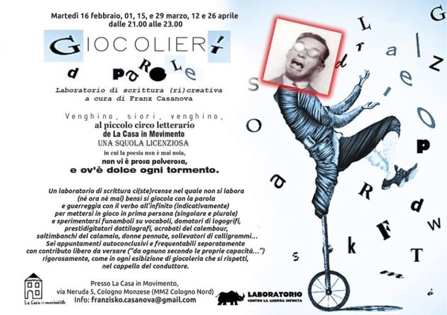 Da gennaio a maggio 2016 la Casa ha ospitato Giocolieri di parole, un laboratorio di scrittura creativa ideato e tenuto da Francesco “Franz” Casanova.